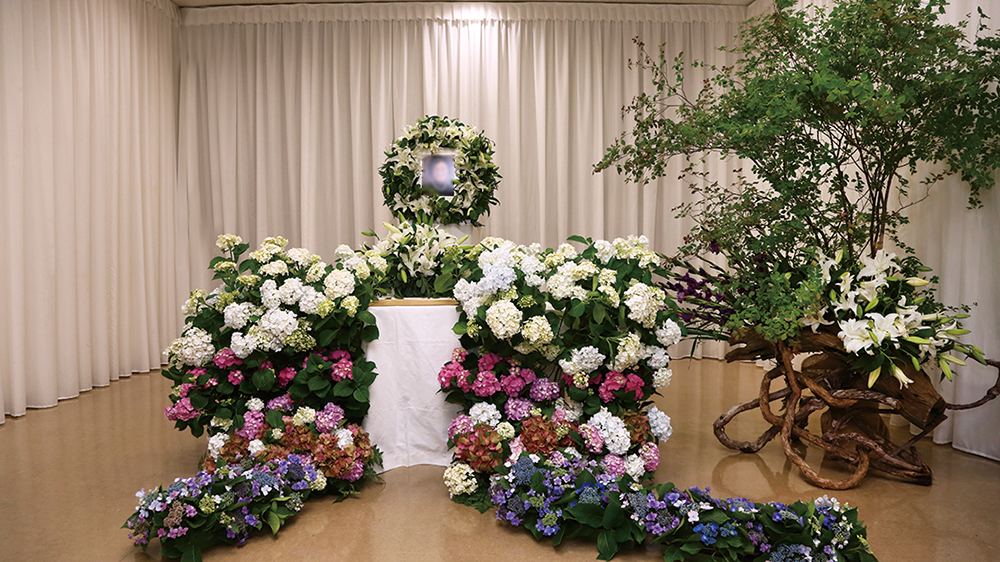 親しい友人たちが参列したオリジナル自由葬。祭壇には舞台花のオブジェ。