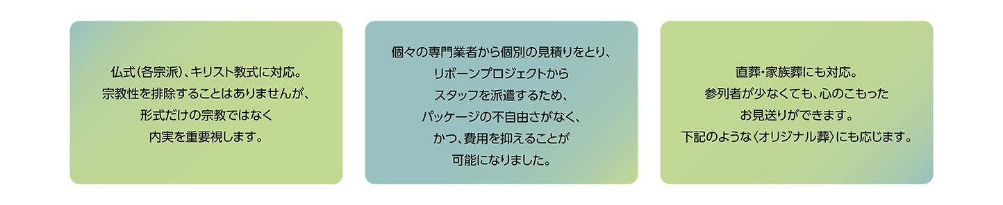 一つ一つのプロセスを、本人も家族も納得して選択できるよう、価値観を同じくする寺院、葬儀事業者、プランナー、